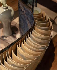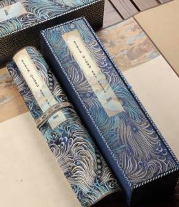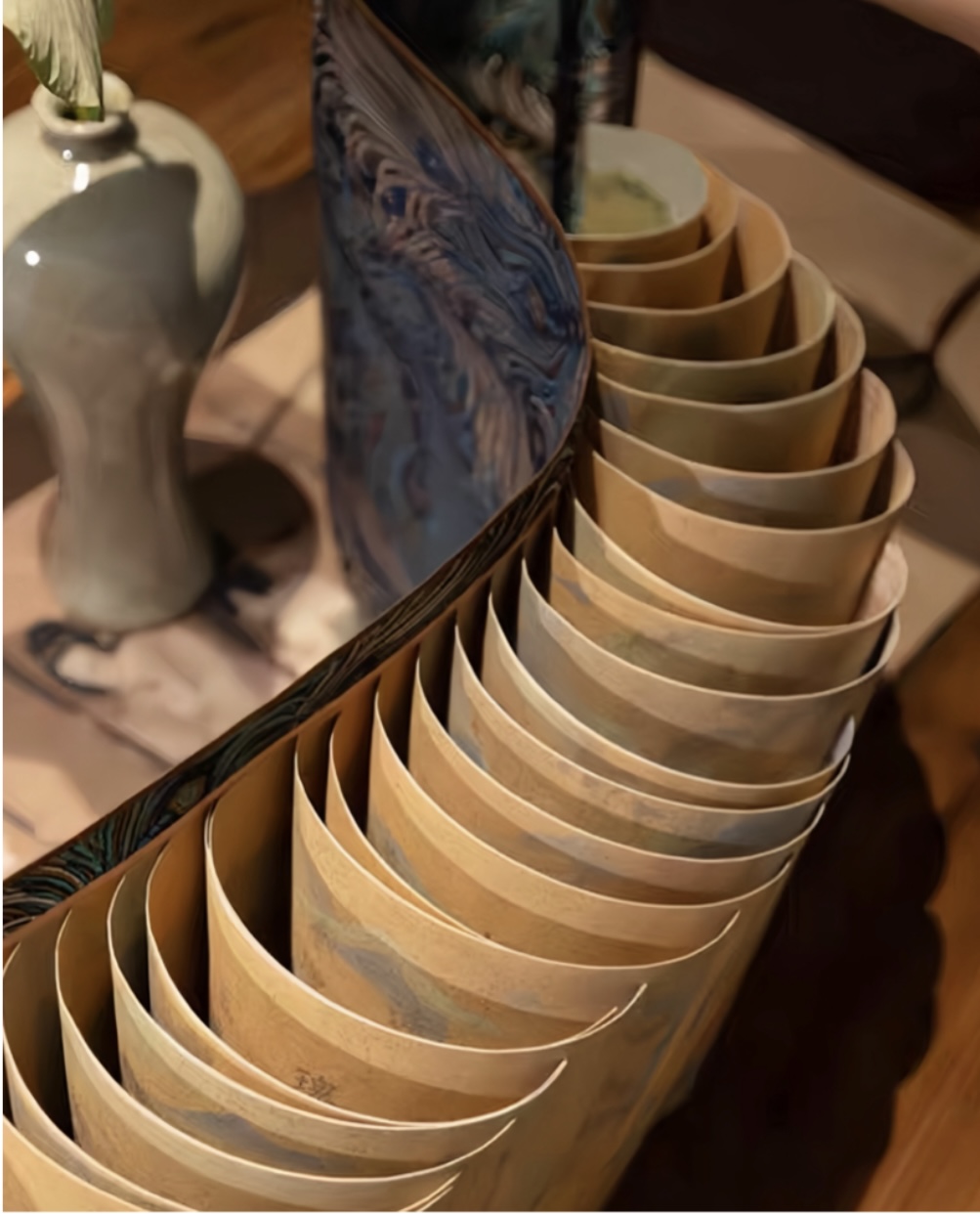 The dragon-scale binding, also known as fish-scale or whirlwind binding, originated in the mid-Tang dynasty during the historical transition from scrolls to bound books. Its structure consists of a base scroll and layered pages that overlap diagonally from right to left. Each page will be affixed beneath the previous one, forming a rhythmic, scale-like sequence. When rolled up, it will function as a scroll; when unrolled, it will open page by page like a book — protecting the leaves while maintaining ceremonial grace and readability.