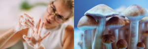 From compulsive behaviors to potential therapeutic interventions. (Left) Excessive hand-washing illustrating compulsive behaviors characteristic of obsessive-compulsive disorder. (Right) Psilocybe cubensis mushrooms containing psilocybin.